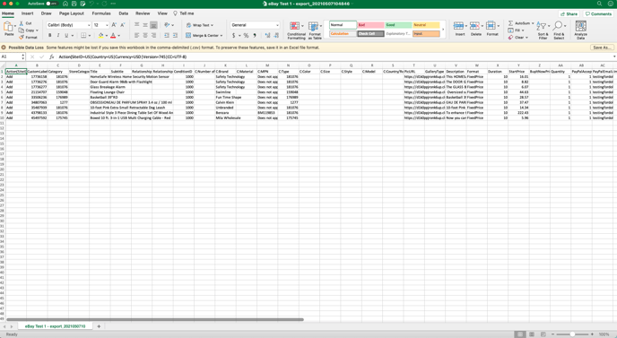 To make changes to your spreadsheet in Excel, you will open your file. Here you will have multiple columns that can be changed. The most common changes made are adding UPC's to items that do not already have one, Price, Quantity, Name, Description, etc.